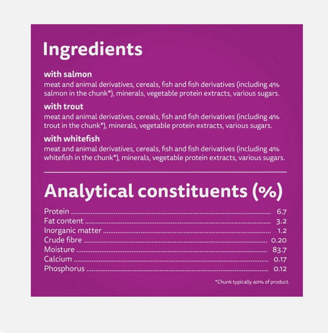 With Salmon Meat and Animal Derivatives, Cereals, Fish and Fish Derivatives (including 4% Salmon in the Chunk*), Minerals, Vegetable Protein Extracts, Various Sugars, *Chunk typically 40% of product With Trout Meat and Animal Derivatives, Cereals, Fish and Fish Derivatives (including 4% Trout in the Chunk*), Minerals, Vegetable Protein Extracts, Various Sugars, *Chunk typically 40% of product With Whitefish Meat and Animal Derivatives, Cereals, Fish and Fish Derivatives (including 4% Whitefish in the Chunk*), Minerals, Vegetable Protein Extracts, Various Sugars, *Chunk typically 40% of product